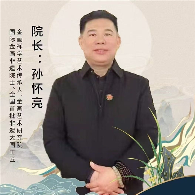 孙怀亮(名曦亮,字本如,号三十三画生,又号金佛子、亮太子、福来恩),安徽淮南人,祖籍山东莱州。作为金画院士,国际伏羲书画院副院长,伏羲金画院院长,广德心定书画院副院长,国家一级美术师,高级非遗导师,全国首批非遗大国工匠、金画禅学非遗艺术传承人、金体字禅学非遗传承人,西冷印刷雅集顾问,中国书法艺术研究院副院长:韩小龙(心定法师)世界易经总会主席,国际伏羲学院院长黄道国师:两位大师亲传弟子。他毕生践行"佛慈如愿"的艺术追求,以高扬中华民族文化主体性为使命,将呵护、弘扬、发展中华文明瑰宝视为历史责任。